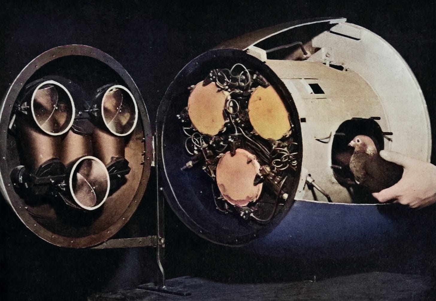 Short for Organic Control, Project ORCON made a small change to B.F. Skinner’s original plan. This time, gold electrodes were attached to the pigeons’ beaks. The plates they used were semi-conductive, so when the beaks hit them, they sent signals to the controlling mechanism showing where the target was.